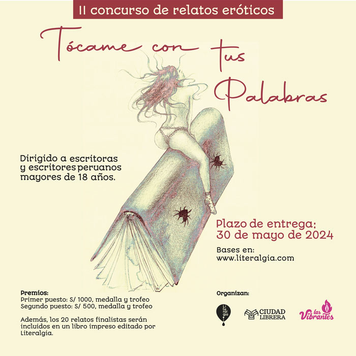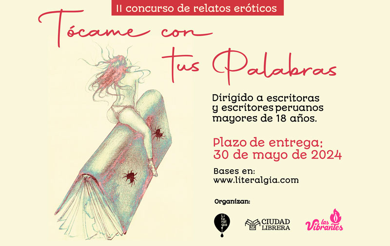 Debido al éxito de la primera edición, y siempre con el objetivo de fomentar la literatura y premiar el talento de los escritores de todo el país, la editorial Literalgia, Ciudad Librera y Las Vibrantes organizan el segundo concurso de relatos eróticos “Tócame con tus palabras”, un certamen que resalta un género literario que se practica desde siempre en nuestra narrativa y poesía, pero es poco difundido.