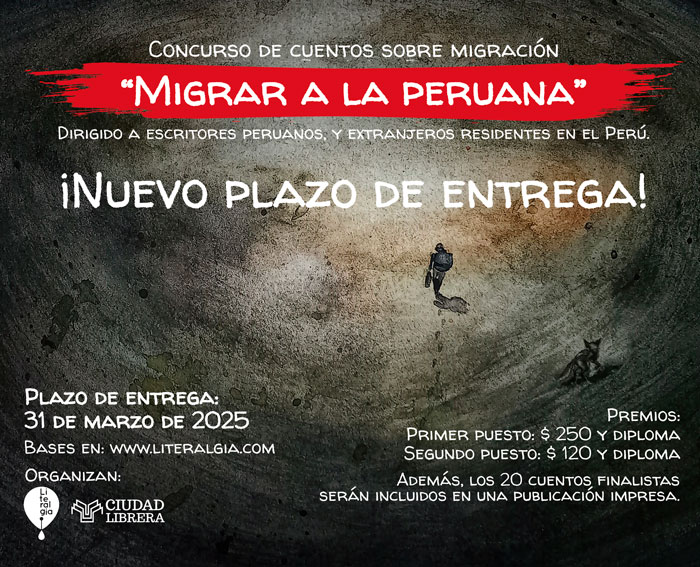 El presente concurso de cuentos busca premiar y dar a conocer las mejores historias que tengan como tema central la migración, poniendo especial énfasis en los temas del desarraigo y del conflicto de identidad. Las 20 mejores historias serán publicadas en un libro bajo el sello de la editorial Literalgia. El primer puesto recibirá además 250 dólares americanos y, el segundo puesto, 120 dólares americanos, además se les otorgará un diploma de reconocimiento.